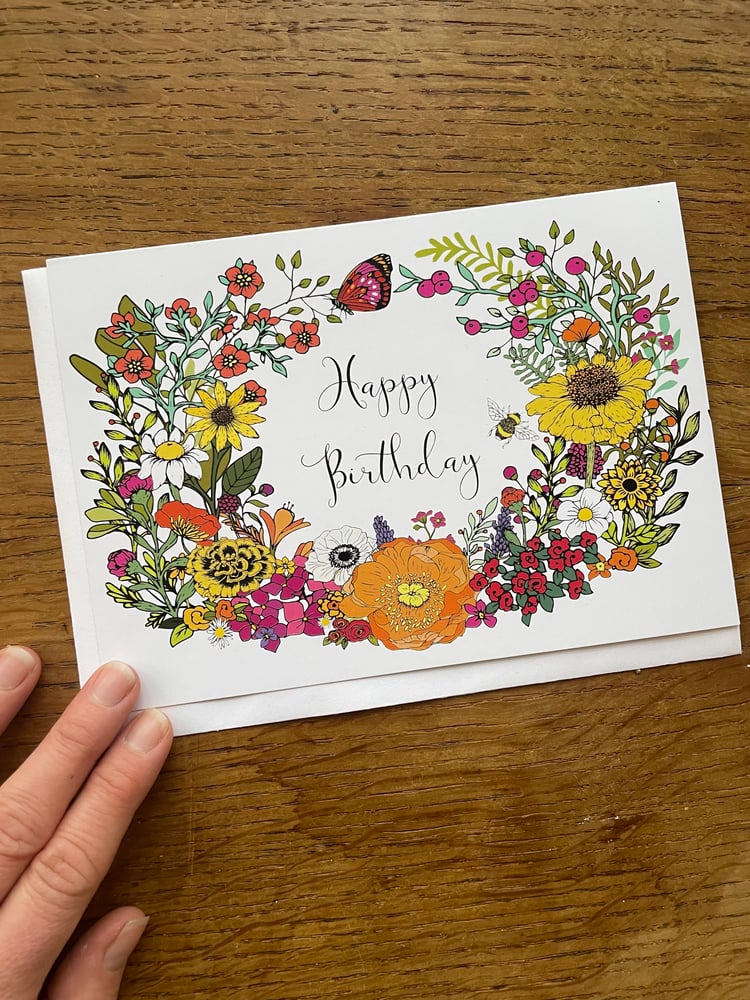 A vibrant birthday card covered in an array of beautiful hand illustrated blooms.